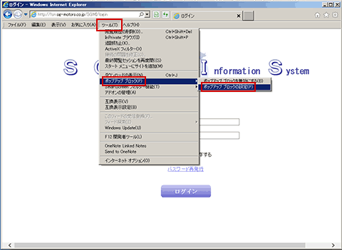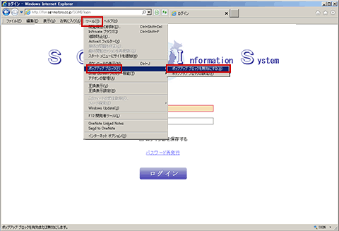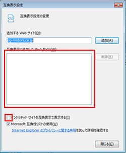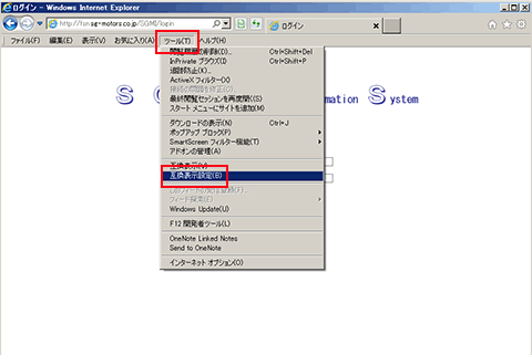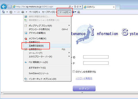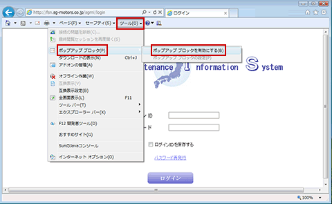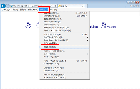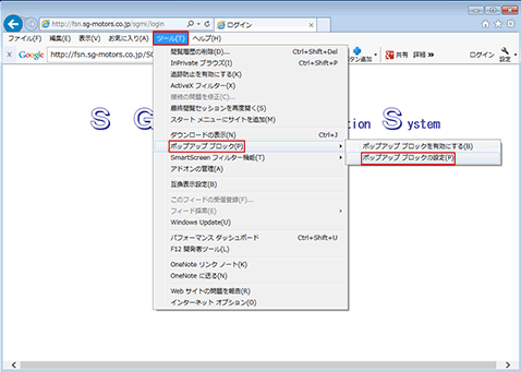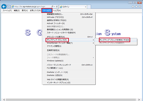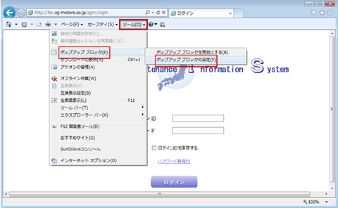 1. Internet Explorerを起動します 2. キーボードの「Alt」ボタンを押し、画面上部に表示された ツール(T) ⇒ 互換表示設定 を選択してください 3. 互換表示に追加したWebサイトの欄に[fsn.sg-motors.co.jp]がないことを確認してください。 4. キーボードの「Alt」ボタンを押し、画面上部に表示された ツール(T) ⇒ ポップアップブロック(P) を選択してください。 5. キーボードの「Alt」ボタンを押し、画面上部に表示された ツール(T) ⇒ ポップアップブロック(P) ⇒ ポップアップブロックの設定(P) をクリックしてください 6. 「許可するwebサイトのアドレス」に[fsn.sg-motors.co.jp]を入力し、追加(A)をクリックして下さい 7. 「許可されたサイト(S)」に[fsn.sg-motors.co.jp]が追加されていることを確認後、閉じる(C)をクリックしてください 以上で設定完了です >ページの先頭へ |