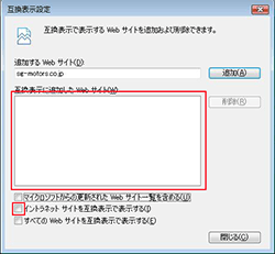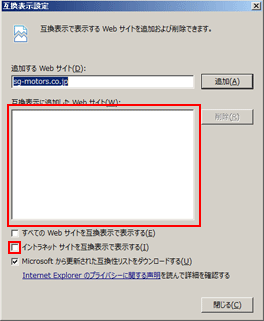1. Internet Explorerを起動します 2. キーボードの「Alt」ボタンを押し、画面上部に表示された ツール(T) ⇒ 互換表示設定 を選択してください 3. 互換表示に追加したWebサイトの欄に[fsn.sg-motors.co.jp]がないことを確認してください。 4. キーボードの「Alt」ボタンを押し、画面上部に表示された ツール(T) ⇒ ポップアップブロック(P) を選択してください。 5. キーボードの「Alt」ボタンを押し、画面上部に表示された ツール(T) ⇒ ポップアップブロック(P) ⇒ ポップアップブロックの設定(P)をクリックしてください 6. 「許可するwebサイトのアドレス」に[fsn.sg-motors.co.jp]を入力し、追加(A)をクリックして下さい 7. 「許可されたサイト(S)」に[fsn.sg-motors.co.jp]が追加されていることを確認後、閉じる(C)をクリックしてください 以上で設定完了です>ページの先頭へ |