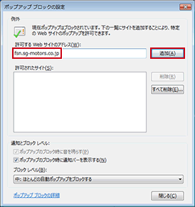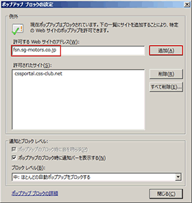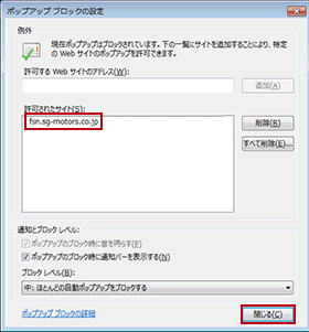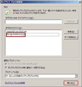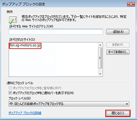 3. 互換表示に追加したWebサイトの欄に[fsn.sg-motors.co.jp]がないことを確認してください。 4. キーボードの「Alt」ボタンを押し、画面上部に表示された ツール(T) ⇒ ポップアップブロック(P) を選択してください。 5. キーボードの「Alt」ボタンを押し、画面上部に表示された ツール(T) ⇒ ポップアップブロック(P) ⇒ ポップアップブロックの設定(P) をクリックしてください 6. 「許可するwebサイトのアドレス」に[fsn.sg-motors.co.jp]を入力し、追加(A)をクリックして下さい 7. 「許可されたサイト(S)」に[fsn.sg-motors.co.jp]が追加されていることを確認後、閉じる(C)をクリックしてください 以上で設定完了です >ページの先頭へ |