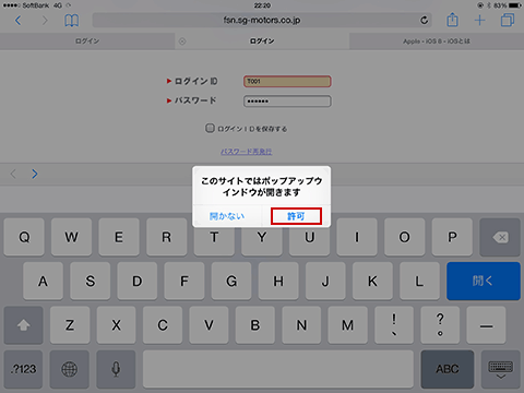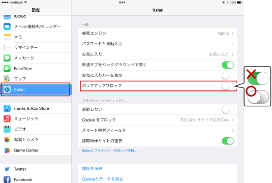 1. [設定]をタップしてください 2. [safari] をタップし、[ポップアップブロック]の設定をオフにしてください 3. システムのログイン時に 『このサイトではポップアップウインドウが開きます』 と表示されますので、 [許可] をタップしてください 以上で設定完了です >ページの先頭へ |